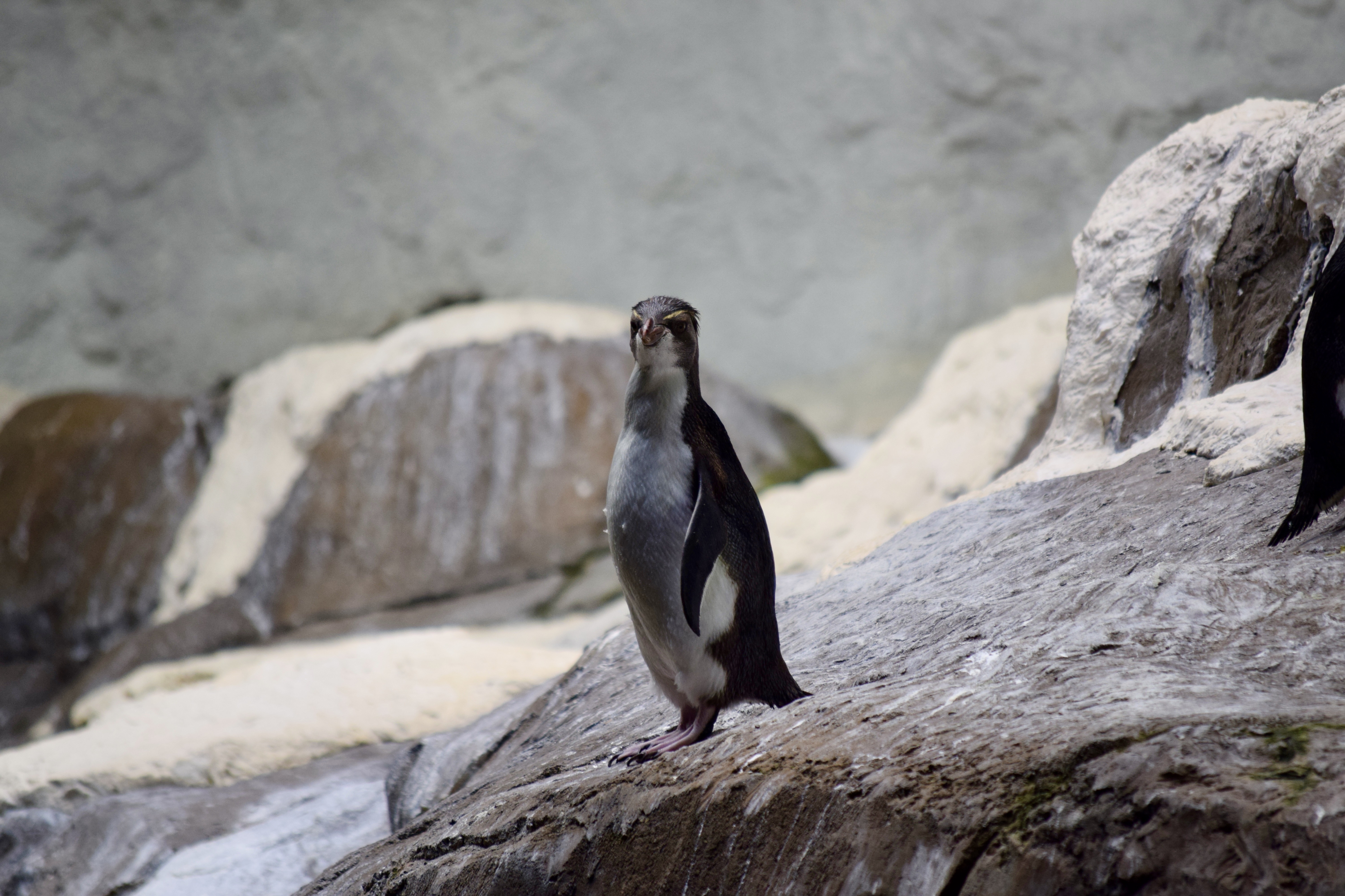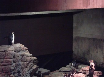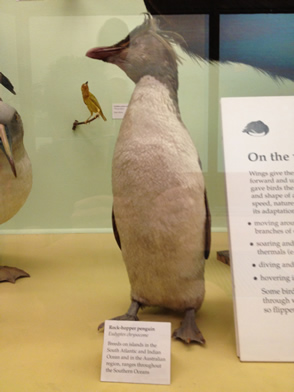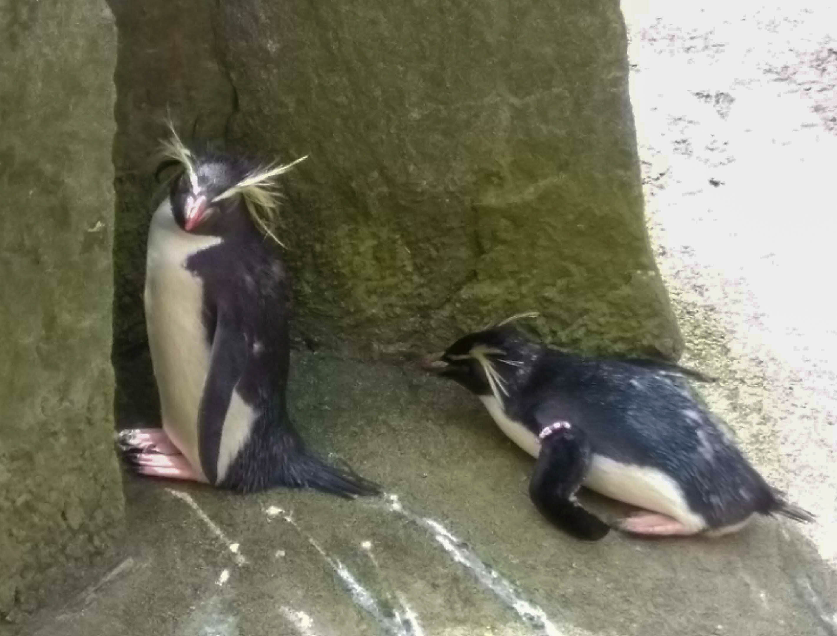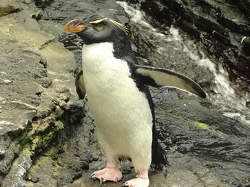 Four kinds of penguins in the Penguinarium: little, macaroni, king penguins and these rockhoppers. The rockhoppers right) have a yellow line above the eye.