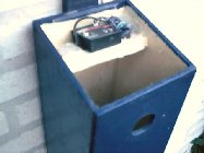 The nesting box is constructed of 6 mm thick wood. However, it is advised to use thicker wood (up to 15 mm) to keep the heat out. When the hole is 33 mm, the most plausible bird to build a nest is the great tit. How to saw the wood is described here. The first camera used was a black/white camera with an analog output. The advantage of black/white cameras is that the are very sensitive and that they normally have no infrared filters built in.