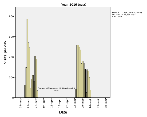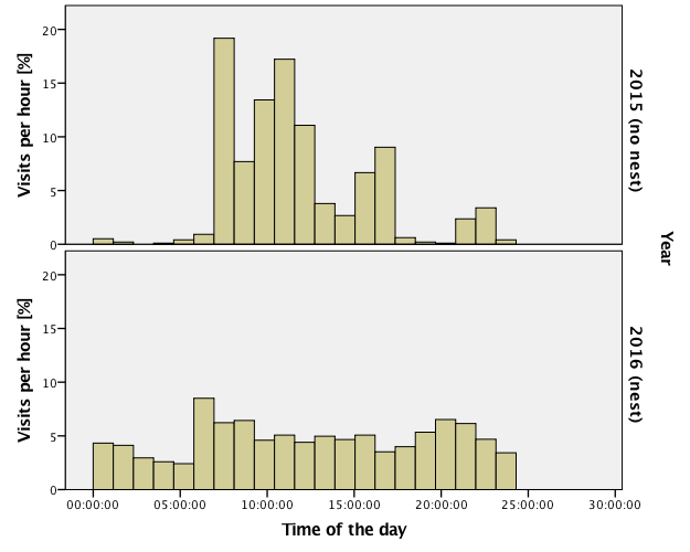 There was no nest in 2015, but the activity has been monitored with a camera. In 2016 there was a nest. The SPSS graphs below show that the activity in the year without a nest has a peak around mid November. There were up to 50 movements per day. When there was a nest, the activity was much higher: up to hundreds of movements per day. Unfortunately, the camara was switched off in April, but still we can have an idea of what was going on.