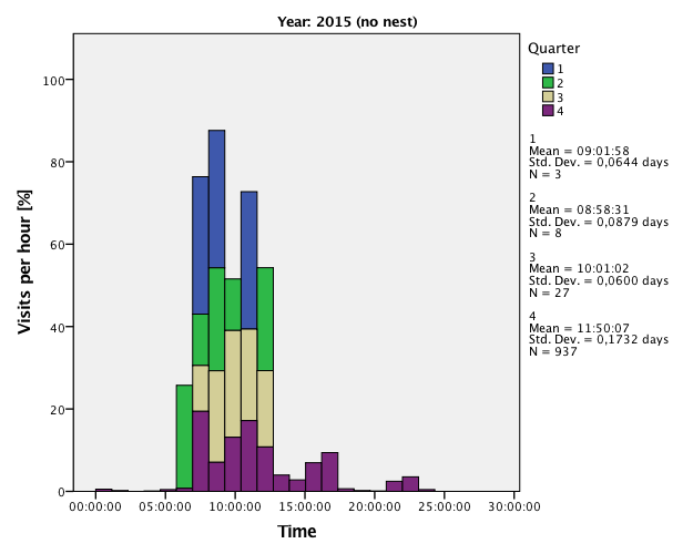 It is also interesting to see at what time of the day most acivity takes place. This appears to be at 7:00 in the morning and there is some tail in the evening. When there is a nest, activity is 24 hours per day. In 2015, when there was no nest, the activity is not distributed uniformly. Together with the insight that there is a clear different behaviour in November, I was wondering whether the daily pattern is different in November. This can be seen in the last picture where visits per hour are plotted for each quarter. Indeed, in Q4 with the month of November, there is a different visiting pattern as in the other quarters.