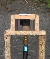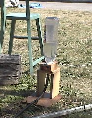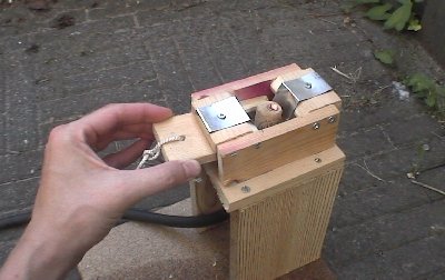 The first picture shows the launching nozzle and release system. The bottle is fixed by a U-shaped piece of wood. In this way the moment of launching is not determined by the tightness of a cork but can be decided manually.